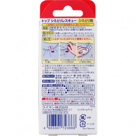 | 일본 **라이온(Lion)** 브랜드의 옷 얼룩 제거제인 **“탑 시미토리 레스큐” 본체 17ml + 흡수 시트 5매 세트**입니다. 물 성분 얼룩(예: 간장·커피·와인)부터 기름 성분 얼룩(예: 미트소스·립스틱·파운데이션)까지 이 1개만으로 대응 가능한 본격 얼룩 제거제입니다. 흡수 시트와 함께 사용하면 얼룩이 섬유 안으로 퍼지지 않아 **옷감 손상 없이 깔끔한 얼룩 제거**가 가능합니다. 외출 시에도 휴대 가능한 컴팩트 사이즈로 옷 케어에 편리합니다. | |